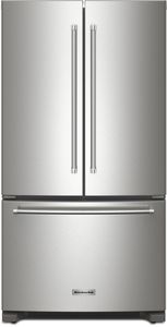 Enjoy freshness within reach. This KitchenAid® counter-depth French door refrigerator features an interior water dispenser to keep the outside looking sleek. Get customizable storage with an adjustable wood-look nesting shelf and convenient space for wide items.Read More